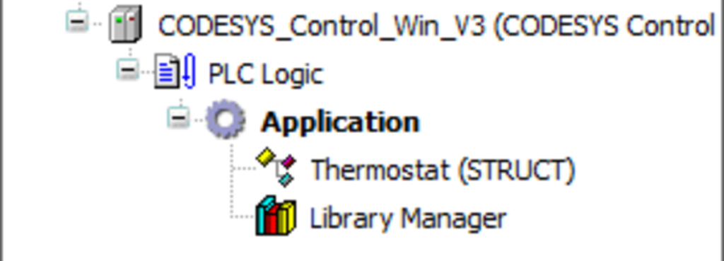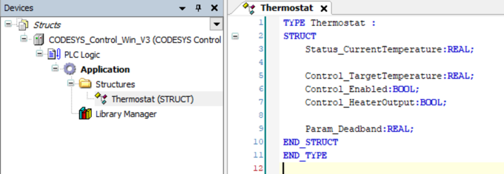 We need to define a variable that is the Thermostat type. We’ll do that in the POU in which the Thermostat structure is needed.