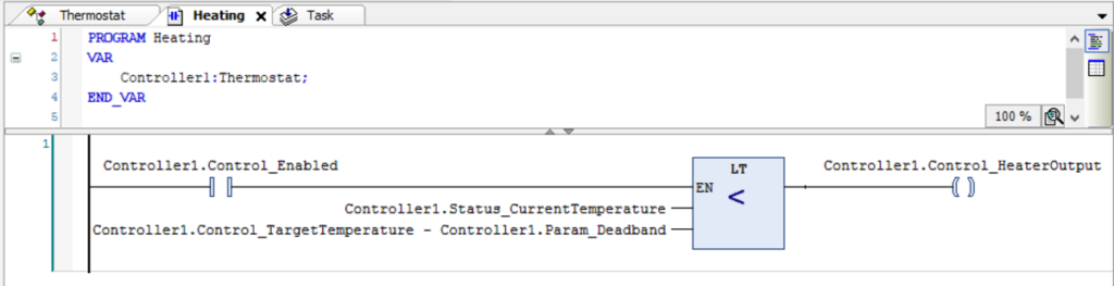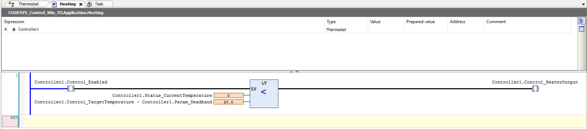 Controller1:Thermostat := (Control_TargetTemperature := 21, Param_Deadband := 0.5);