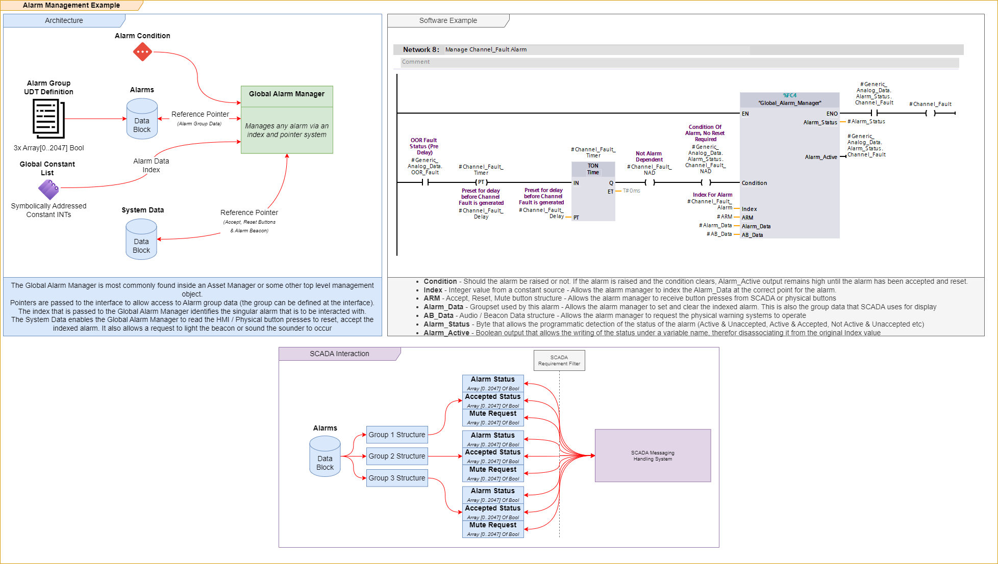 The “Global Alarm Manager” is the logic that sets, accepts and resets the alarm. It also provides a status for us to control SCADA / HMI indications with