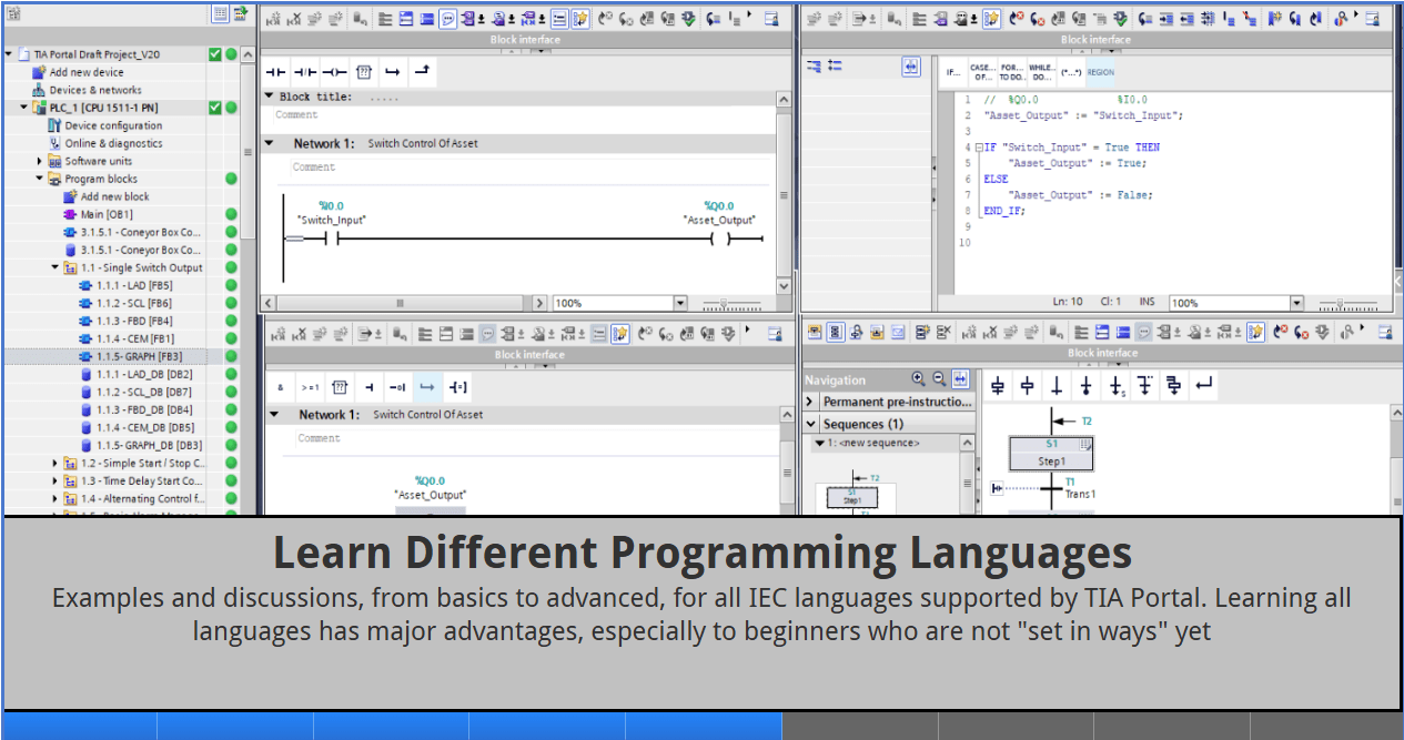 And most importantly, you’ll tie it all together in a realistic example project: a tank level control system with multiple PLCs, HMI, and communication. Once the basics are learnt, we’ll expand on to more advanced knowledge to really set you up for success.