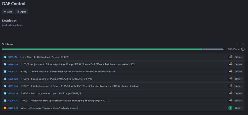 Once I’ve got the FDS in hand, I’ll start mapping out the workflow in JIRA. This is where I break things down into smaller, manageable tasks. For example, I’ll have a story dedicated to something like “Pump Control,” and under that, sub-issues for programming interlocks, alarms, and other details.