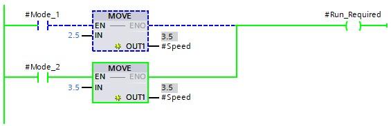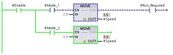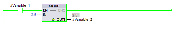The above image shows an example of a Contact enabling a Move instruction to move the value of 2.5 into Variable_2