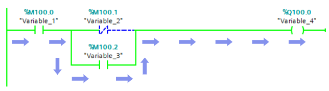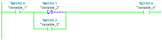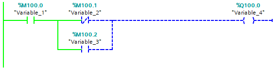 In order for the Variable_4 to be True, Variable_2 must be False, OR Variable_3 must be True. This is because Variable_2 and Variable_3 are branched, creating multiple routes for the logic to travel. Remember that Variable_2 is a Normally Closed Contact, so allows the logic through when the variable assigned to it is False