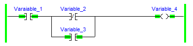 Variable_1 and Variable_3 are both Normally Open Contacts, represented symbolically by an open break in the logic line. Variable_2 is a Normally Closed Contact, represented symbolically by a closed break in the logic line.