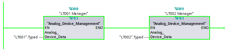 The LT001 Manager instance and the LT002 Manager instance both use the Analog_Device_Management code within the Function Block, but use different datasets. In Siemens TIA Portal you can see this denoted by the %DB8 and %DB9 above the two Box Instructions. This means one is using Data Block 8 and the other is using Data Block 9.
