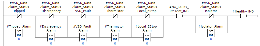 The logic consists of many checks against Alarm Statuses, with a Branch around to provide continuation of TRUE logic if the alarm is disabled (set to 0 in this case).