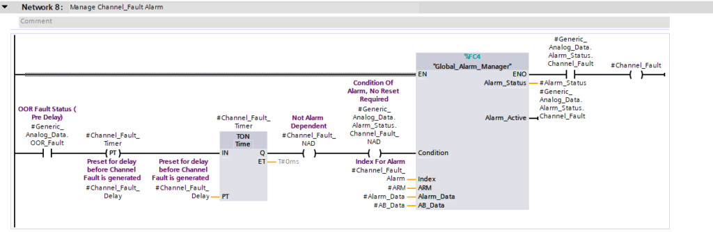 Some may argue that the TON and preceding logic should have been on a separate Network, then the Global Alarm Manager should have followed after. However, my counter to that is that it becomes more difficult to realize the relationship between the two rungs. The approach above means the end result is visual and easy to follow, it’s clear to see how Channel_Fault is set and why.