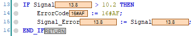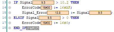 In the above example, because IF Signal > 10.2 was False, ELSIF Signal > 0 was evaluated as True and ErrorCode was set to 16#0