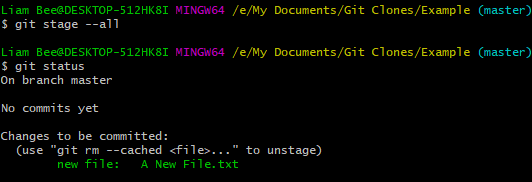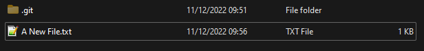 The “A New File.txt” file is now green, prefixed with “new file”. This tells us that git has staged a change in this file, which is the type “new file”. In some graphical representations of Git, this is used to show different icons etc.