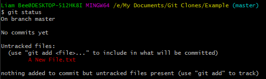 git status outputThis tells us that “A New File.txt” has been added to the local directory, but is not yet being tracked in our local repository. In order to track it, we need to stage & commit it…