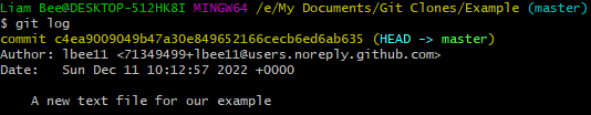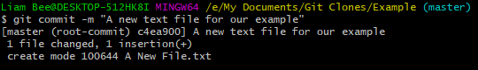 git commit -m exampleThe output of this shows that the file has been successfully committed to our local repository.