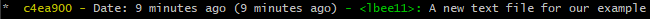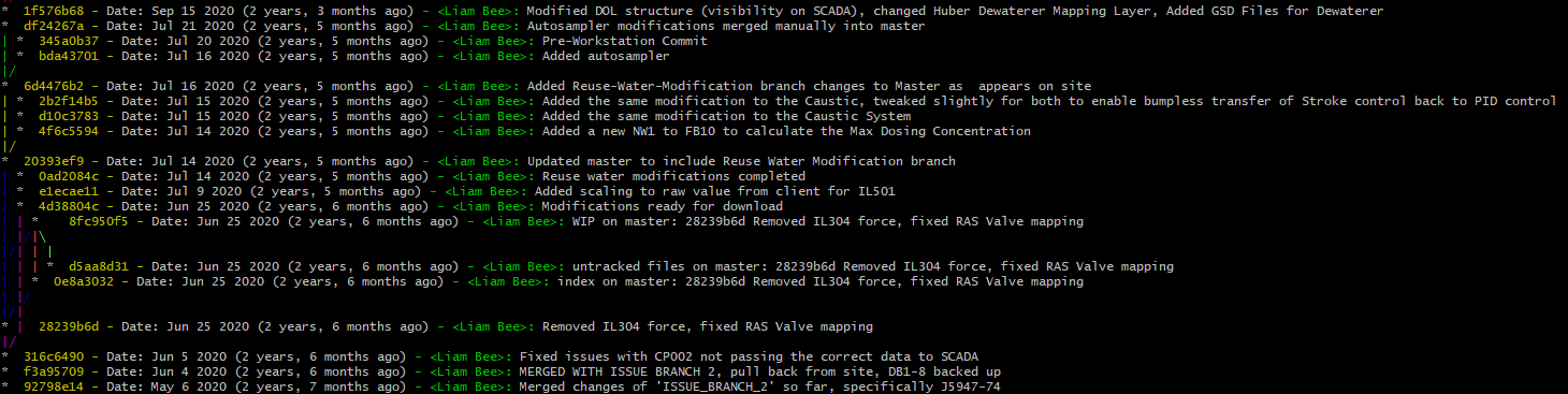 By reducing the size of the entry, using the shortened version of the ID and making dates relative up to a point, it’s far easier to see how the project has developed. This view also draws lines representing Branches if you have more than 1 branch of development: