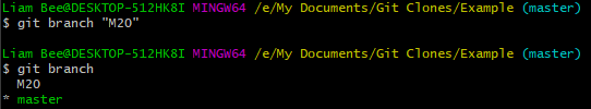 git branchThe above called the git branch command twice, once with the additional option of "M20", to create a new branch. The second call omitted the option of text, so lists the available branches.
