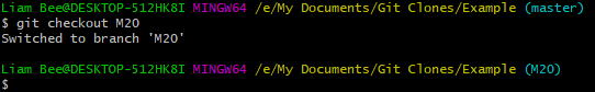 You can switch branches by using the command: git checkout M20, this would give the following output: