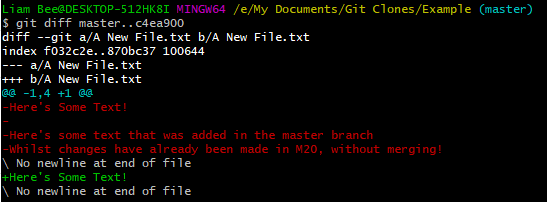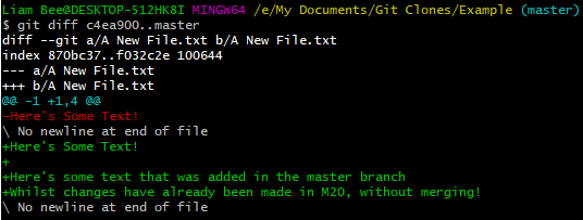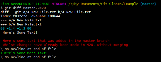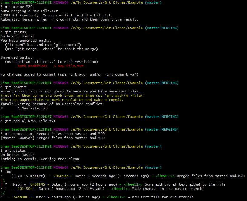git merge M20– this resulted in a conflict. Git could not tell which file was the correct one to keep, or if we wanted to merge them togethergit status– This showed me the reason why it couldn’t be merged. Both files have since been modified. This is true, both instances of “A New File.txt” have changed since commitc4ea900- Manual Modification Of File – Because this is a text file, I had the opportunity to access the file and remove some placeholders set by git. Git had placed
