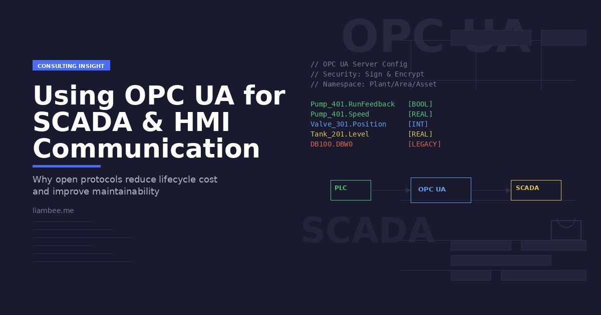 OPC UA changes that model completely. Instead of building communication around fixed memory addresses or proprietary protocols, OPC UA introduces a structured, secure, and vendor-neutral way to exchange data between controllers, SCADA systems, and enterprise platforms. The impact of this goes well beyond the communication layer itself. It directly affects maintainability, cybersecurity posture, scalability, and long-term project cost.
