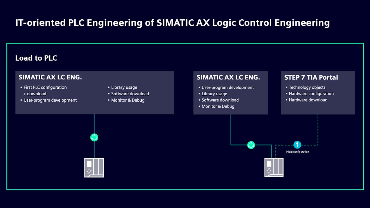 Siemens’ own target-system overview makes the current relationship very clear. AX can handle user-program development, library usage, software download, and monitor/debug activities, but TIA Portal still appears in Siemens’ own hybrid workflow where technology objects and hardware configuration are involved.