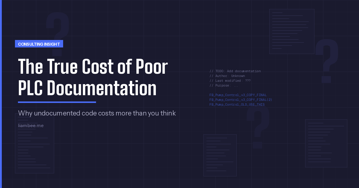 Then there’s the migration problem. At some point, every system needs upgrading. Moving from one platform to another, or even upgrading within the same platform, requires understanding what the existing code does and why it does it that way. Without documentation, migration projects balloon in scope because every function block becomes an investigation rather than a conversion.