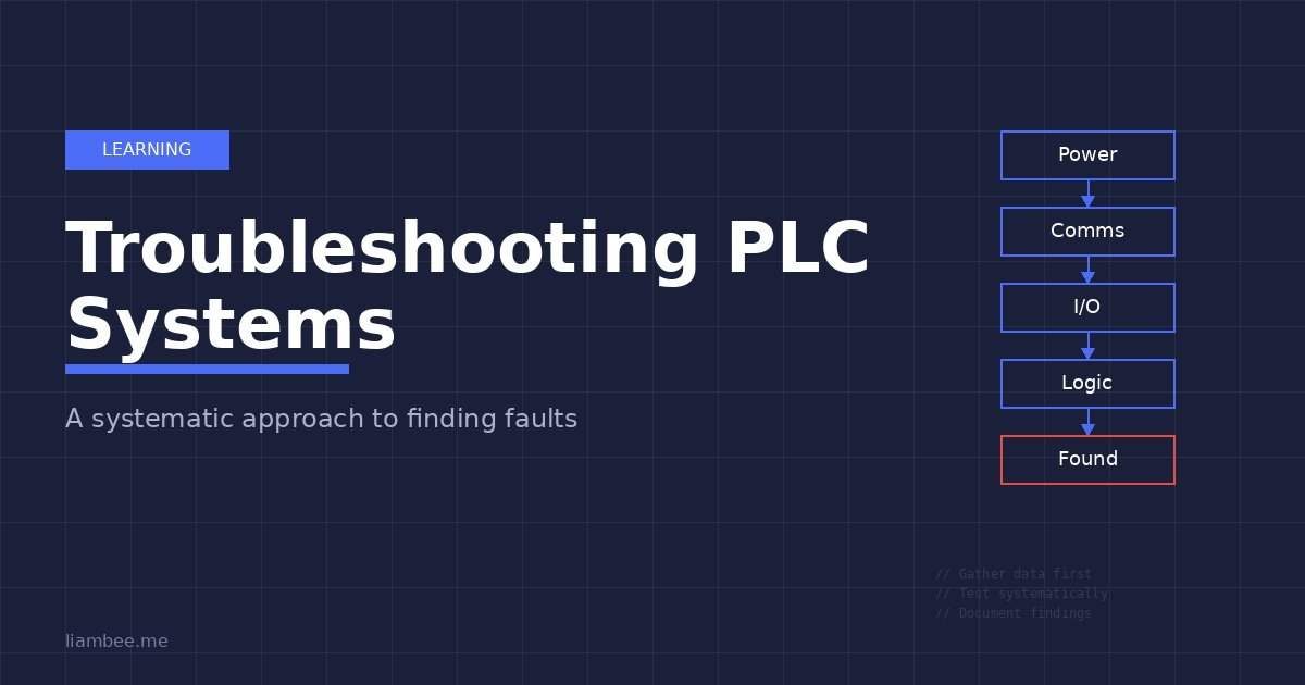 This hierarchy prevents common mistakes like troubleshooting complex logic when a loose wire caused the problem, or rewriting HMI screens when the PLC communication failed.