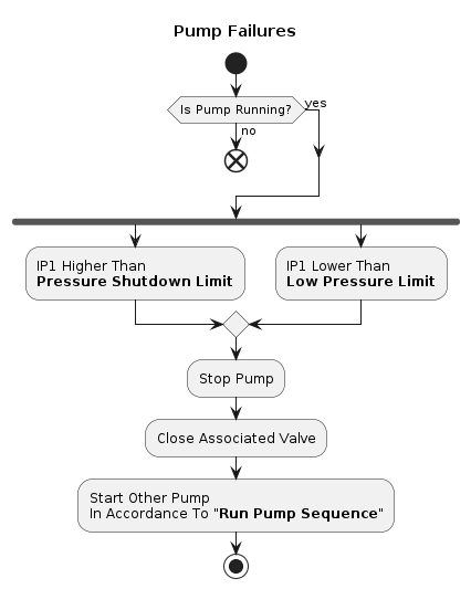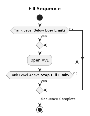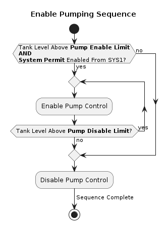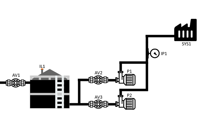 A basic 2 pump system that feeds a material into a factory process. The system is basic, with 2 direct online pumps (no variable speed control) and two upstream isolation valves. The material tank contains a level sensor and a fill valve. The post-pump pipework contains a pressure sensor and the factory process (SYS1) calls for material via a signal detailed in the below flow charts.