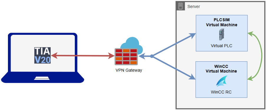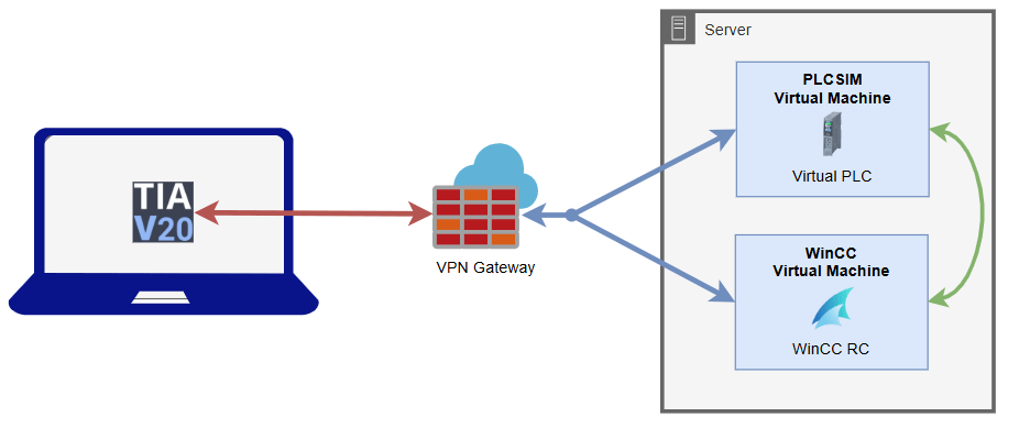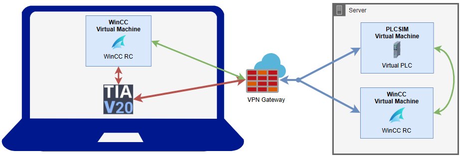 This approach allows for additional WinCC instances to be created locally and then attached to the Virtual PLC via the VPN gateway. This means that I can have a local copy for updating whilst testing continues on the server VM, and then (via GIT usually) new versions are pushed to the server for updating.