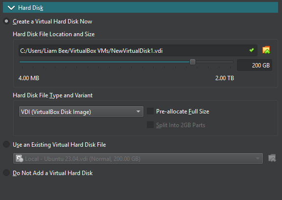 In the Hard Disk section, ensure you give enough Virtual Hard Disk space for Windows and anything else you want to install. This is dynamically allocated as required, up to the maximum size defined.