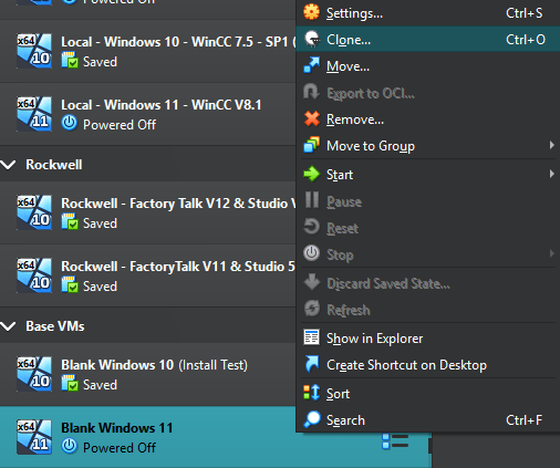 Now that you have a Blank Windows VM, we can Clone it to create a start point for a new VM, which will ultimately become the PLCSIM Advanced VM to host the Virtual PLC