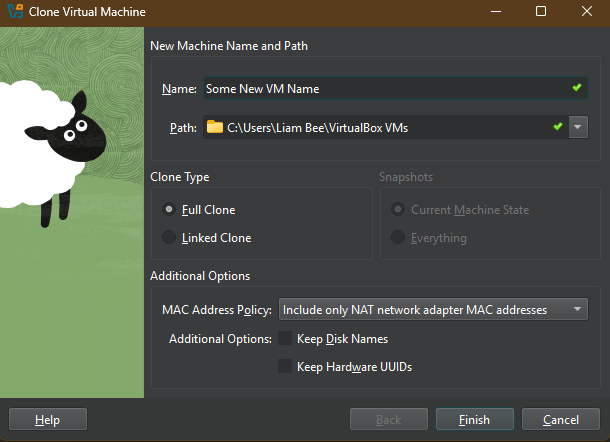 The Clone Virtual Machine dialog box should be set up exactly how the clone is needed from the get-go, but make sure that it does look the same as above. You don’t want a Linked Clone. Whilst Linked Clones can save on resources in the host, they can become problematic when more than one is run at the same time, or the underlying linked resources are changed. Let’s keep things problem free by having a Full Clone