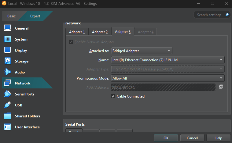 In this case, Adaptor 3 is configured as my Bridged Adaptor to my Ethernet Connection. This is the connection on which my Host machine is connected to my home/office network. I want my PLC to accessible on this network so it can be seen by any device on the network.