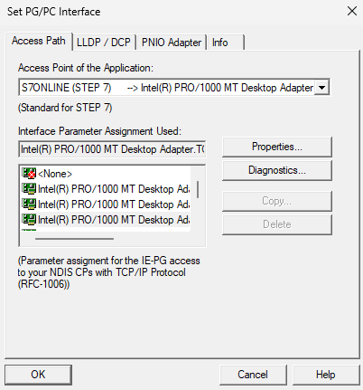 The image above shows the Access Point of the Application is set as S7ONLINE (STEP 7) and is connected to the Intel(R) PRO/1000 MT Desktop Adaptor. This is the ethernet port of the VM. We should NOT be using PLCSIM, despite using PLCSIM Advanced for the PLC.