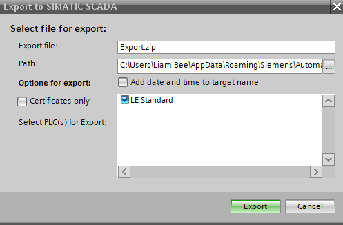 By right-clicking on the PLC item and choosing Export to SIMATIC SCADA, a dialog will appear: