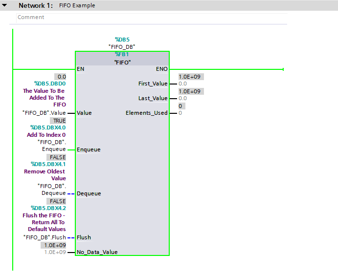 The block is also equipped with 3 outputs that state the First_Value, Last_Value and total number of Elements_Used. These can be used to interact with the FIFO for logic purposes in your project.