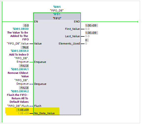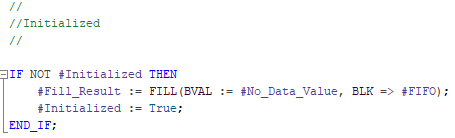 No_Data_ValueThis IF Statement executes the first time the block is scanned. The FILL command sets every element in the FIFO array to the No_Data_Value. It then sets the Initialized value to True so that the initialization event cannot occur again.