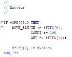 When the ORE[0].Q value (which is a rising edge from the Enqueue input) is True, the MOVE_BLK shifts all elements starting at element 0 into element 1.