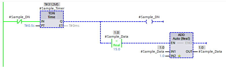 The Sample-Timer simply sets the Sample_DN to True every 0.5 seconds for 1 scan. This is then used to set a Sample_Data value to a maximum of 15.0