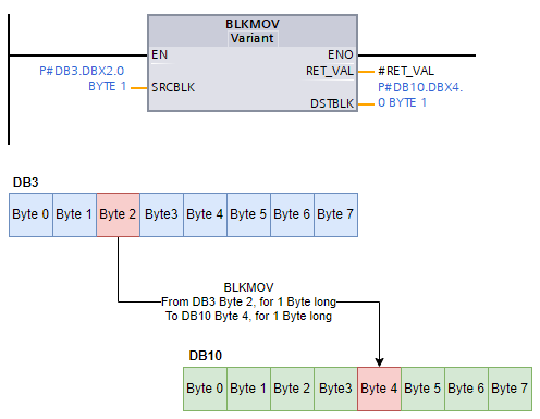 This shows that the BLKMOV instruction is pointing to Byte 2 in DB3 for 1 Byte long. This is then being moved into Byte 4 in DB10, again for 1 Byte long.
