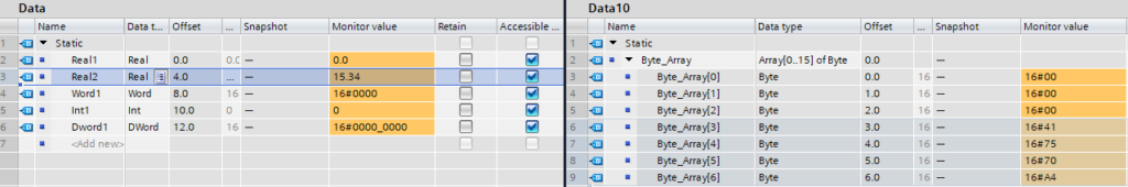 The above shows the Real2 value of 15.34 being moved via BLKMOV into the DB10 - Data10 block at Byte 3 for 4 bytes long.