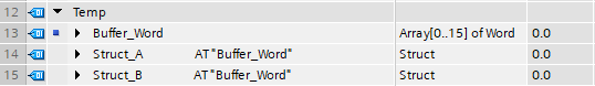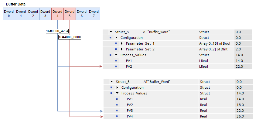 A Dword is 4 Bytes long, so for Struct_A, both Dword 4 and Dword 5 are moved to PV2 as LREAL is 8 Bytes long. But in Struct_B, each Real is 4 Bytes long, so the Dwords from the Buffer are stored in PV3 and PV4, changing the usage of the data.