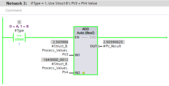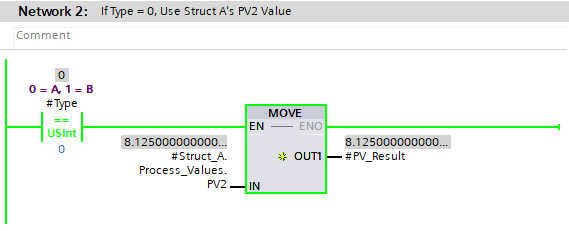 For example, this network is checking if the Type input is 0. If it is, then Struct_A.Process_Values.PV2 is used and passed to the output.