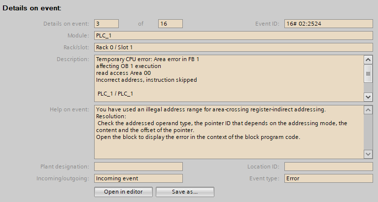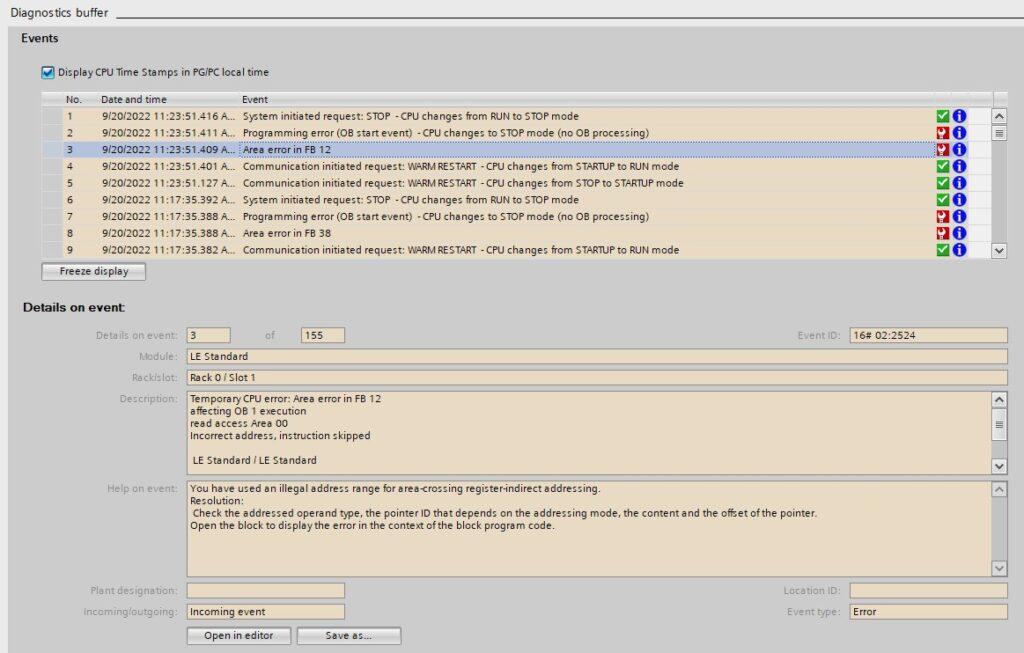 The Read Access Area 00 in the Description means that the error occurred on the INTERFACE of the function block in question, so actually visiting the block won’t help you.