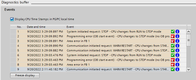 Using the Diagnostics Buffer, you can see why the PLC didn’t start up: