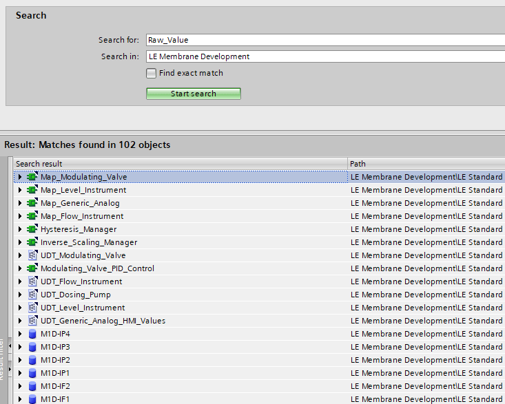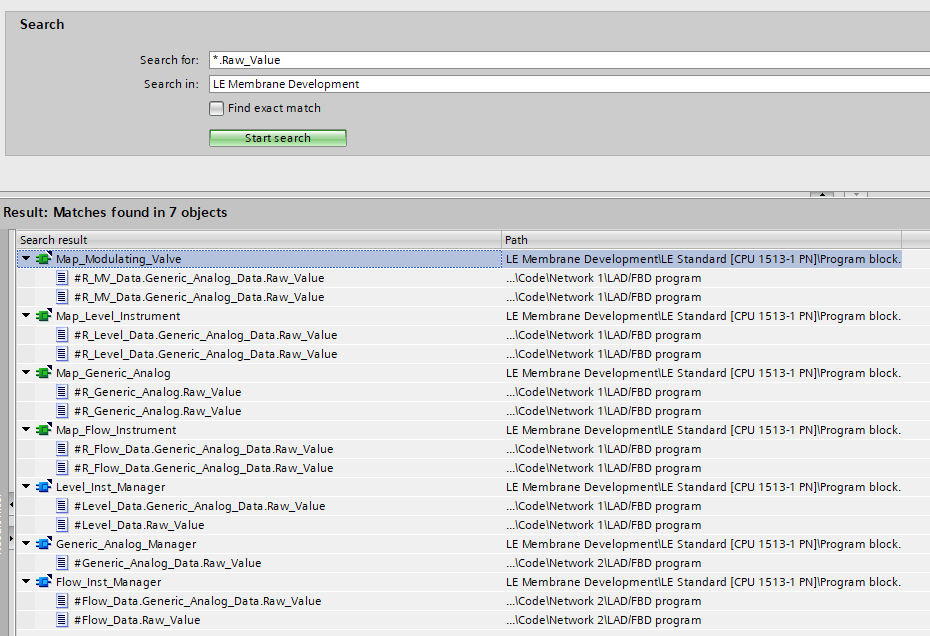 Unfortunately, the Project Search doesn’t tell us if the code is reading or writing like a cross reference does (perhaps Siemens could implement this!). But we can now see everywhere that our .Raw_Value is being used and the different block objects its used within.
