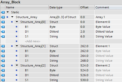 The above image shows Structure_Array declared as Array[0..3] of Struct and the internals of the Struct are defined in the first element of the array (Note that they are not greyed out)
