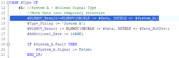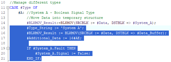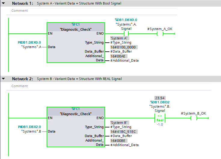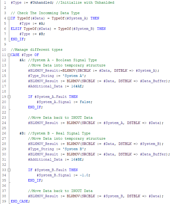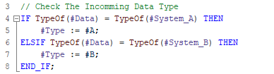 TypeOf, check if the data type within the Variant Data matches a predefined type in the blockThe above SCL code is using the TypeOf instruction to check the original data type of the Variant Data. Our interface of our block contains System_A and System_B, which are both UDTs of different types: