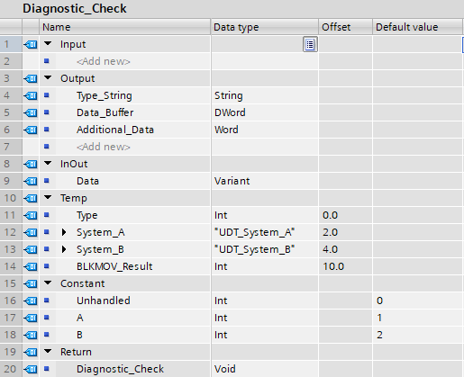 Contains instances of UDT_System_A and UDT_System_B. These are passed in the Main block to the Diagnostic_Check Functions.